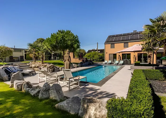 Deze 2-slaapkamer La Villa De Seny, Villa De Charme Avec Jardin ,Piscine Nature, Jacuzzi, Petanque, Fitness, Billard,Ping Pong, is binnen zo'n dan 10 minuten rijden van Tumulus van Ramelot gelegen en beschikt over een privézwembad, een bubbelbad, voor een ontspannen verblijf.